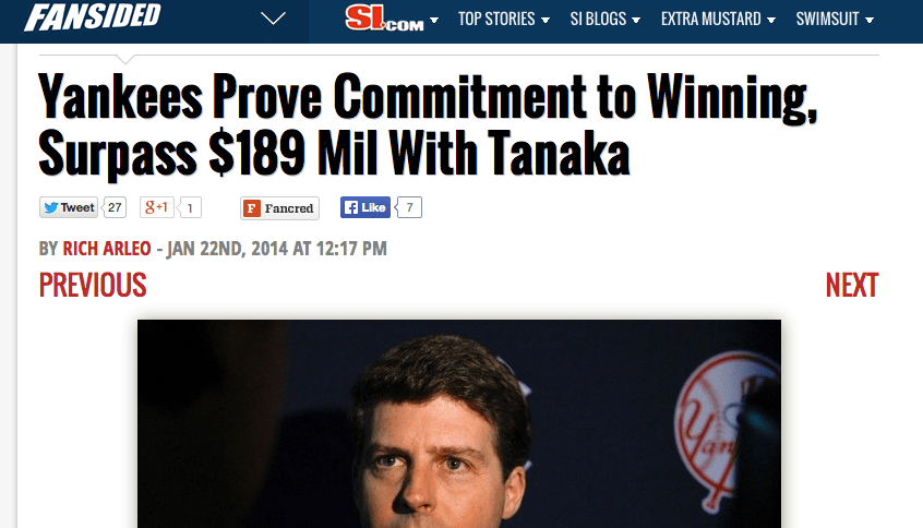 The Yankees truly are looking to change that, and everyone in the organization proved that today by giving Tanaka the fifth-highest contract for a starting pitcher in history–albeit to a guy who hasn’t even thrown a pitch in the major leagues yet.